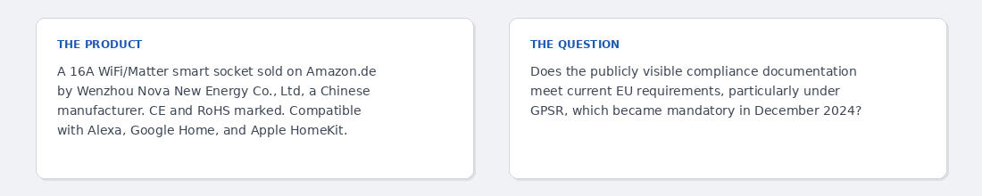 A WiFi smart plug actively sold on Amazon.de carries CE and RoHS marks, but a review of its public-facing documentation reveals it is non-compliant with the EU General Product Safety Regulation (GPSR), which became mandatory in December 2024. No EU Responsible Person is named, no Declaration of Conformity is accessible, and the Amazon listing's compliance fields are empty.