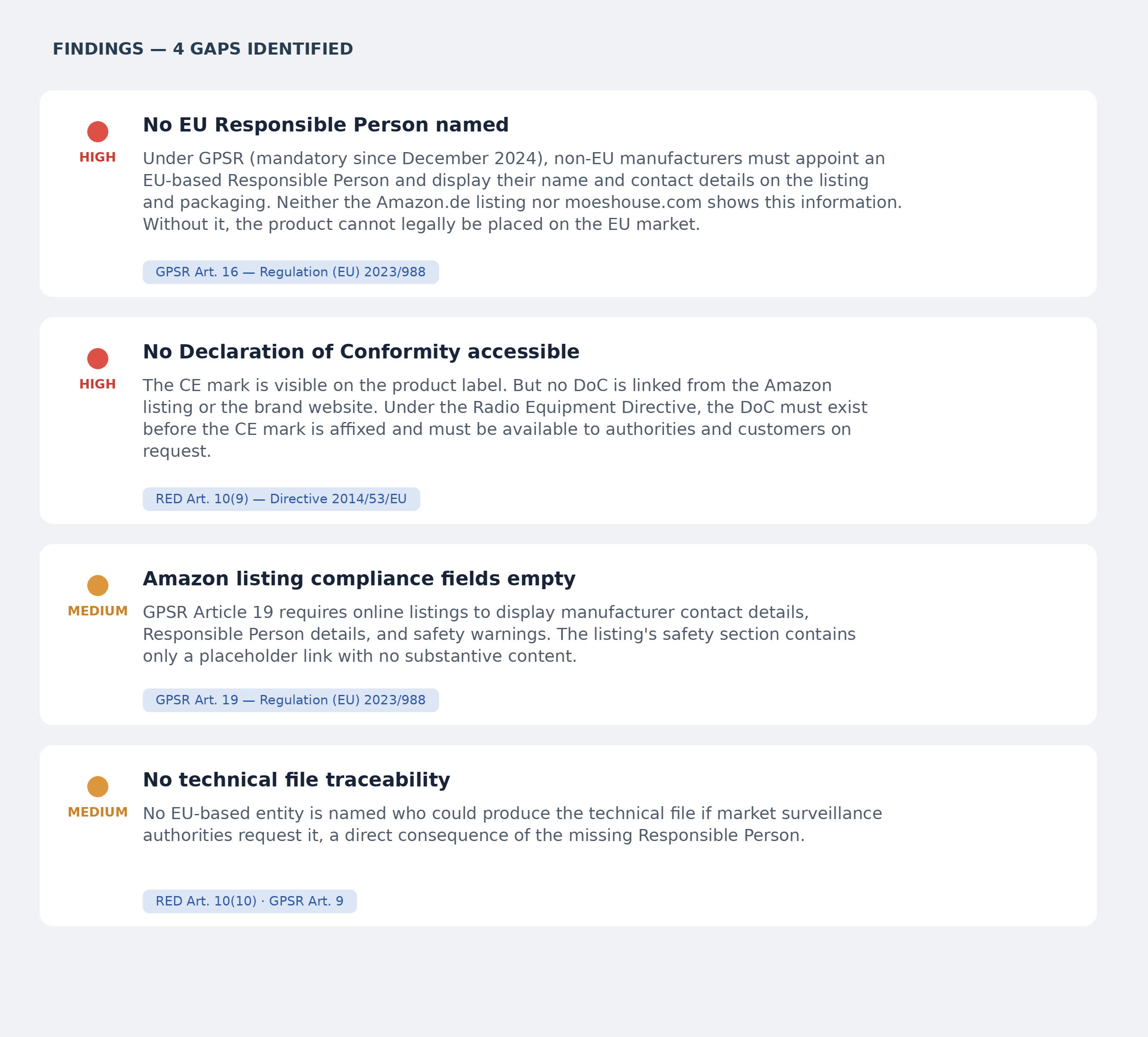 All findings are based on publicly available information reviewed in March 2026: the Amazon.de product listing (ASIN B0CF83KZ94) and moeshouse.com. No physical product was tested. No internal documentation was reviewed. Applicable legislation: GPSR (EU) 2023/988, RED 2014/53/EU, RoHS 2011/65/EU.